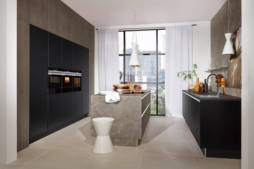 Innym ciekawym materiałem dostępnym w ofercie Nolte Küchen są fronty pokryte warstwą ręcznie nakładanego cementu (linia PORTLAND), które doskonale sprawdzą się w loftowej stylistyce. Fronty są wytrzymałe, a zarazem charakteryzuje je ciekawy wizualnie efekt – w zależności od kata padania światła front za każdym razem będzie prezentował się inaczej. Do wyboru mamy dwa warianty kolorystyczne z tej linii: jasnoszary (Cement agate grey) oraz ciemnoszary (Cement anthracite).